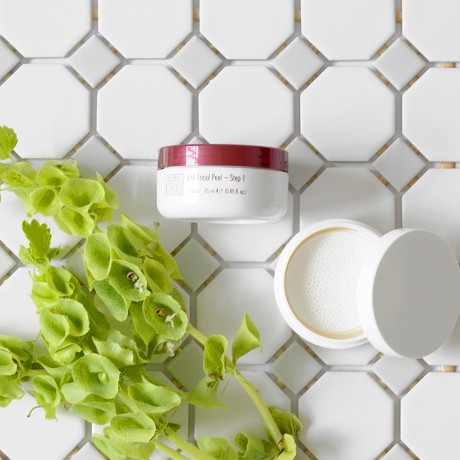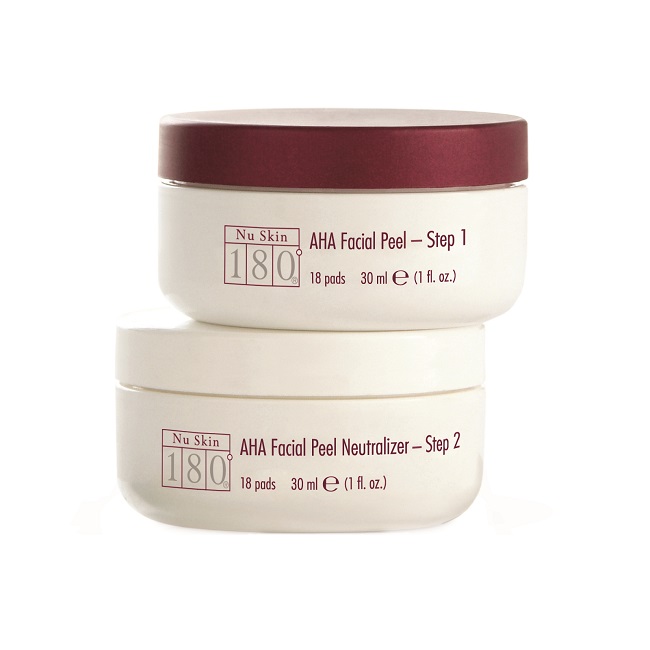 Pasul 1: Aplicaţi uşor un tampon Nu Skin 180° AHA Facial Peel pe faţă şi pe gât, evitând zona ochilor. Lăsaţi soluţia pe faţă cel puţin 10 minute.